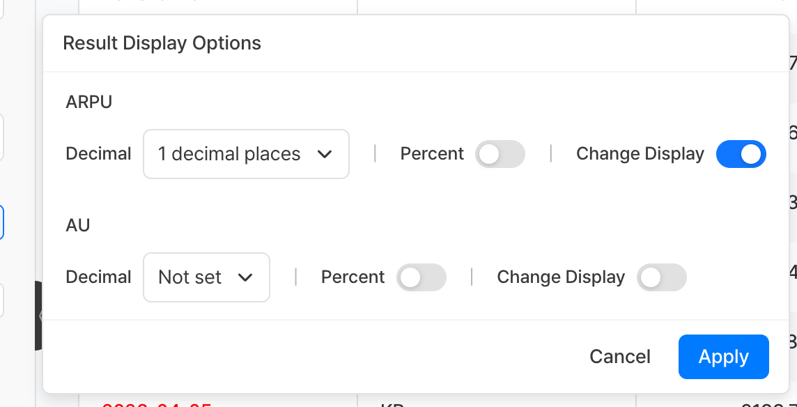 You can create new derived metrics by combining existing measure values with arithmetic operations. Example: in-app revenue / DAU -> ARPU