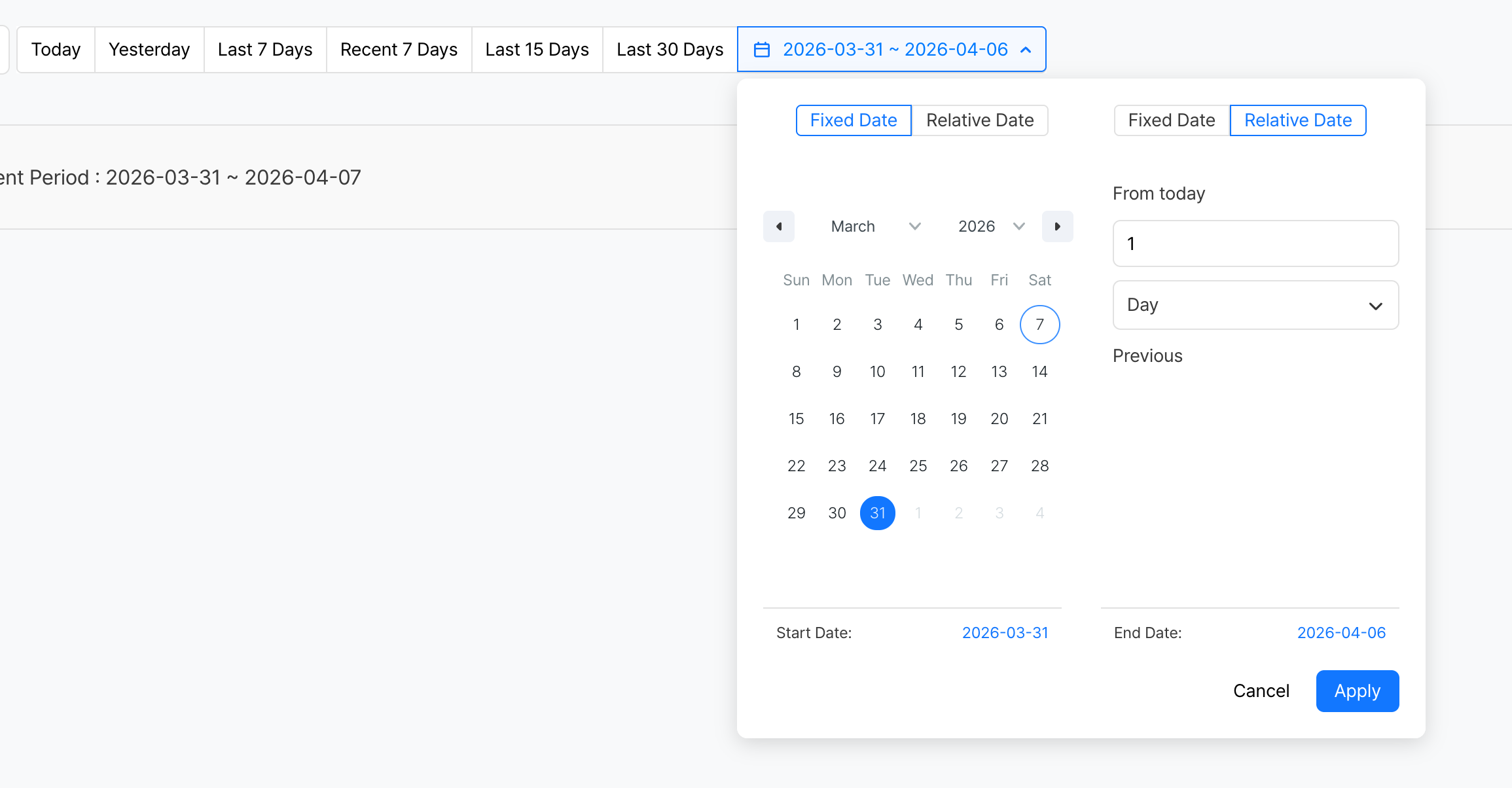 | Recent N days | Calculated from today | Recent 7 days -> 7 days including today |