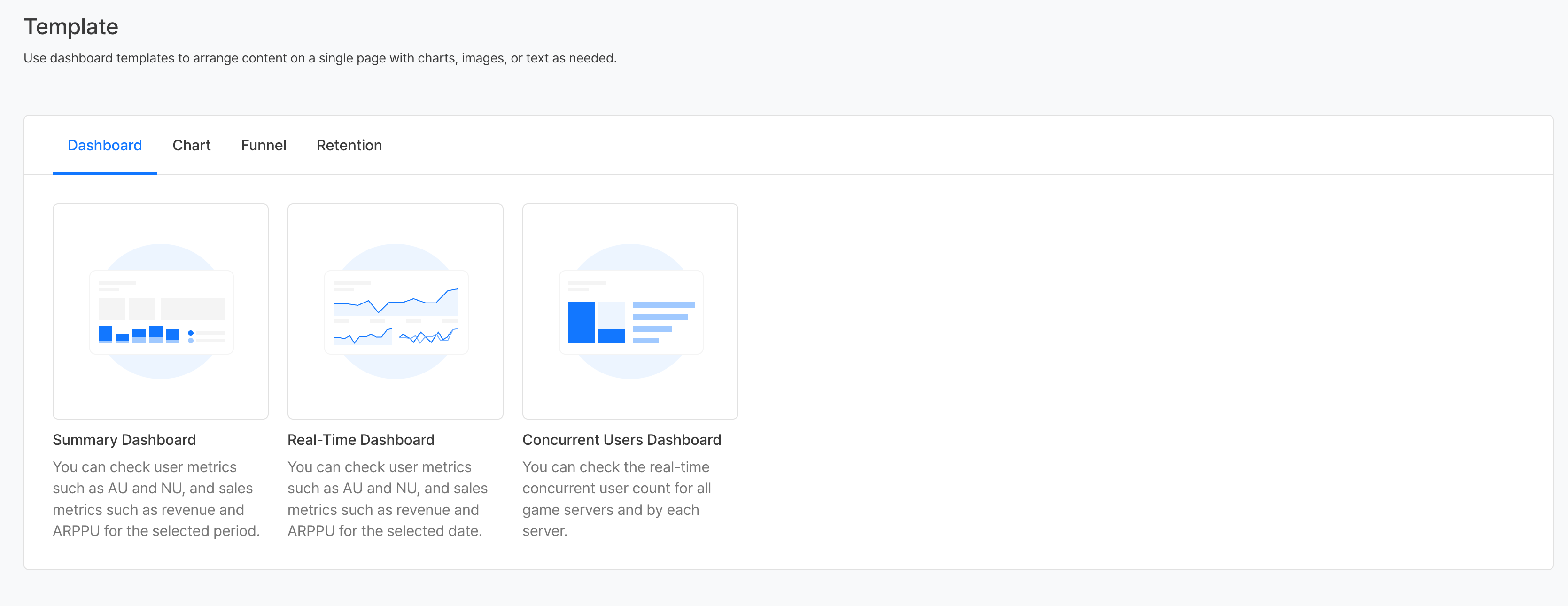 - You can instantly create a summary dashboard that includes key metrics such as AU, NU, revenue, and ARPPU with a single click.