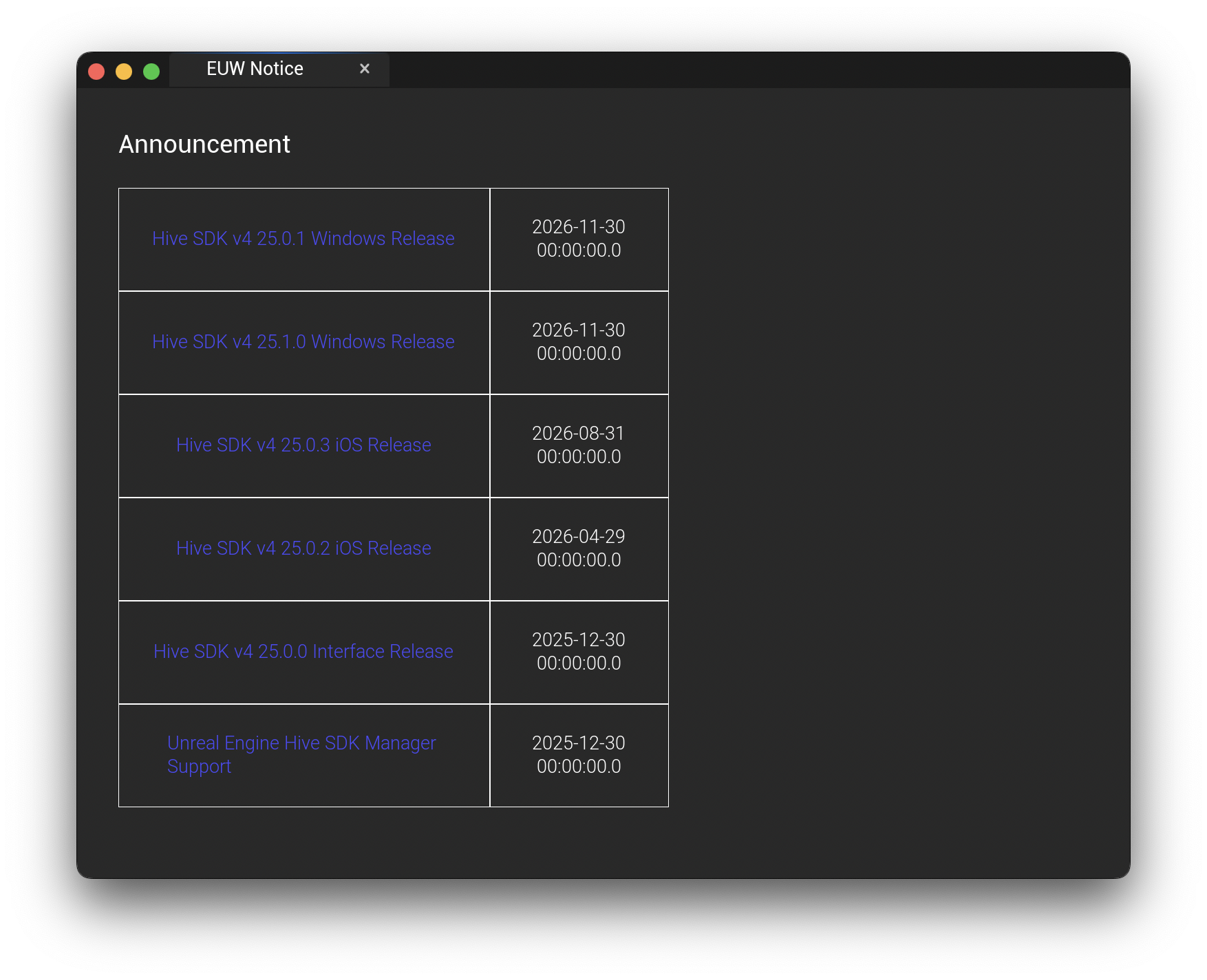 Through the notice feature, you can check news about new SDK manager versions and Hive SDK versions. To call up notices, click Notice in the SDK manager menu.