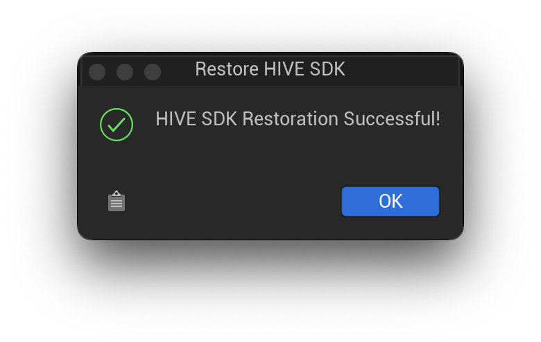 Through the restore feature, you can perform integrity verification and, if there are modified Hive SDK files, restore them to the original files at once.