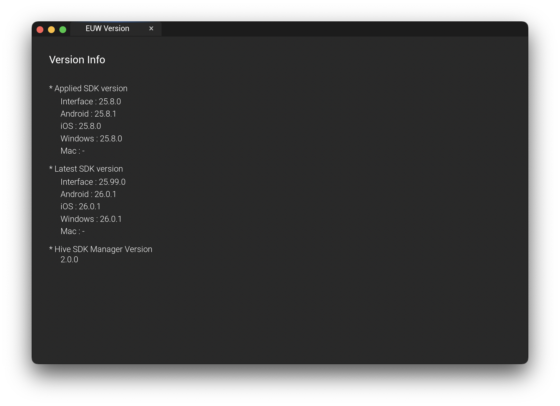 Through the version feature, you can check the information of the currently applied Hive SDK version and the latest updatable Hive SDK version.