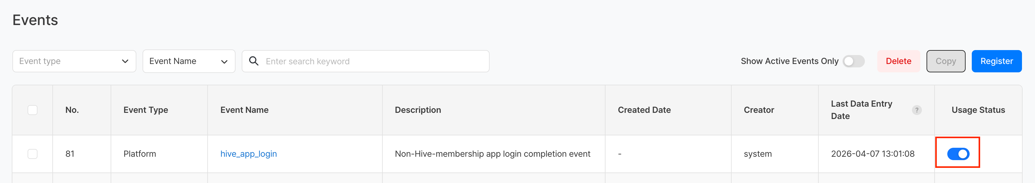 | In Use | Toggle to enable/disable the event. When OFF, the event is hidden from the selection list in charts/funnels/retention |