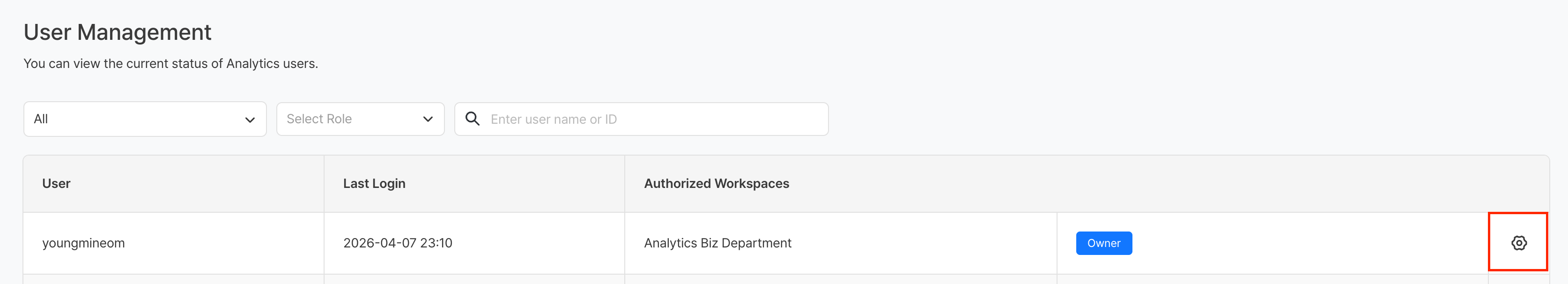 | Workspace Filter | View only users who belong to a specific workspace |