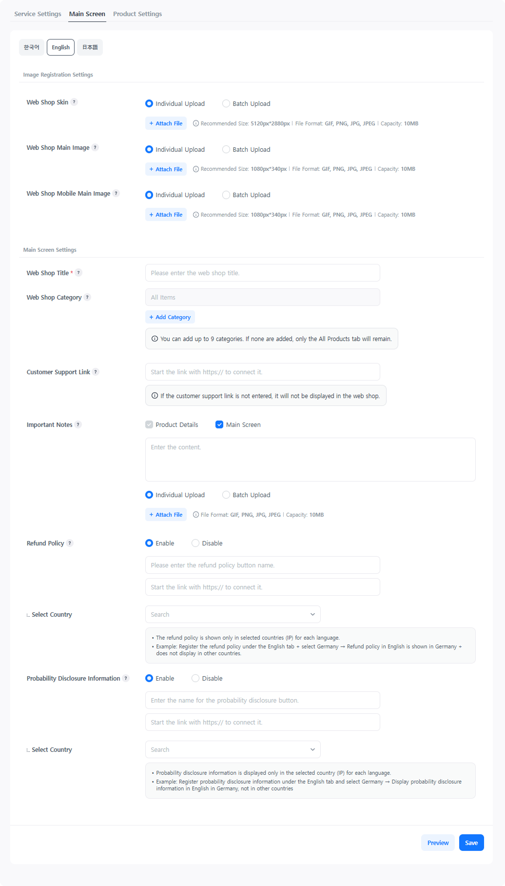 Sets the background image for the Web Shop site. - Displayed the same on both PC and mobile. - You can upload gif, png, jpg, jpeg files. - Supports individual registration for 16 languages or bulk upload. - Learn More