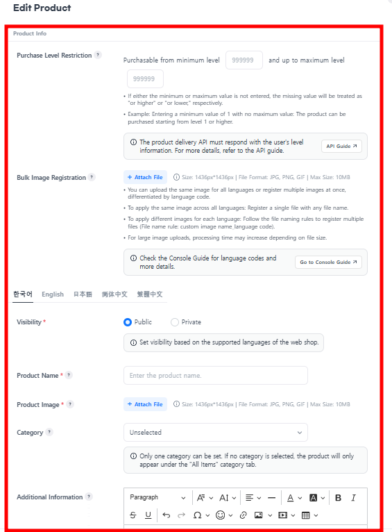 - The purchase level restrictions entered in the console are not automatically displayed in the product information. If you want to display the purchasable level on the product, please enter this information manually in the additional information section.