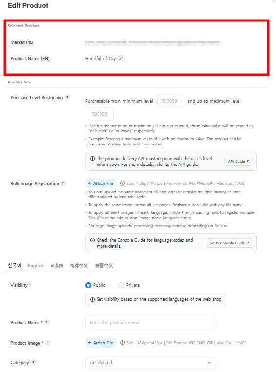- The Web Shop synchronizes the product list registered in the billing menu to manage products. To manage products in the Web Shop, it is mandatory to register the market PID in the billing menu. Please complete the setup at Billing > In-app Purchase > Market PID Registration