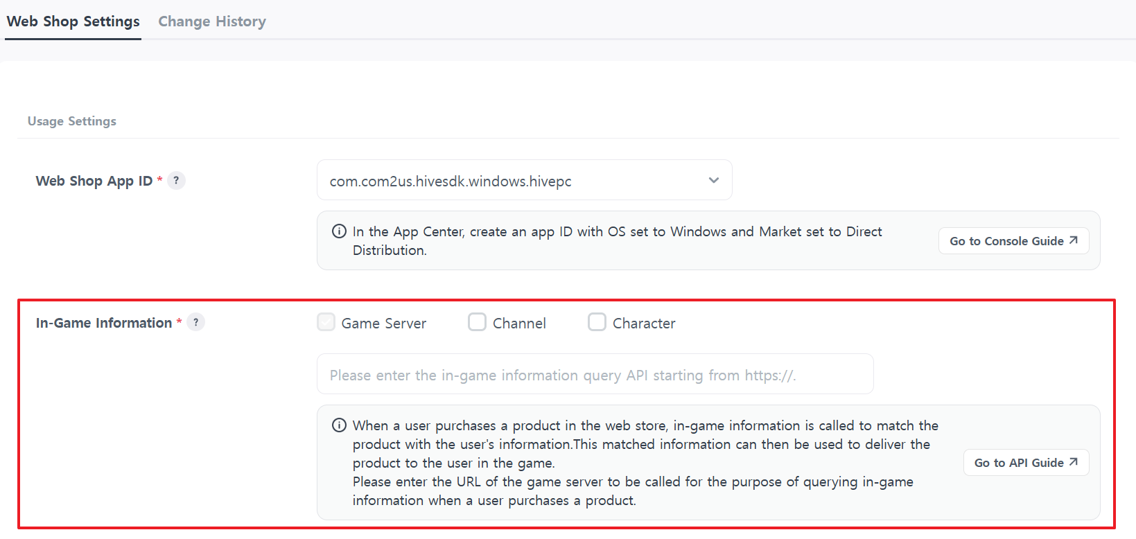 Register the API endpoint in the Hive Console Community & Web Shop > Web Shop > Web Shop Settings > In-Game Information.