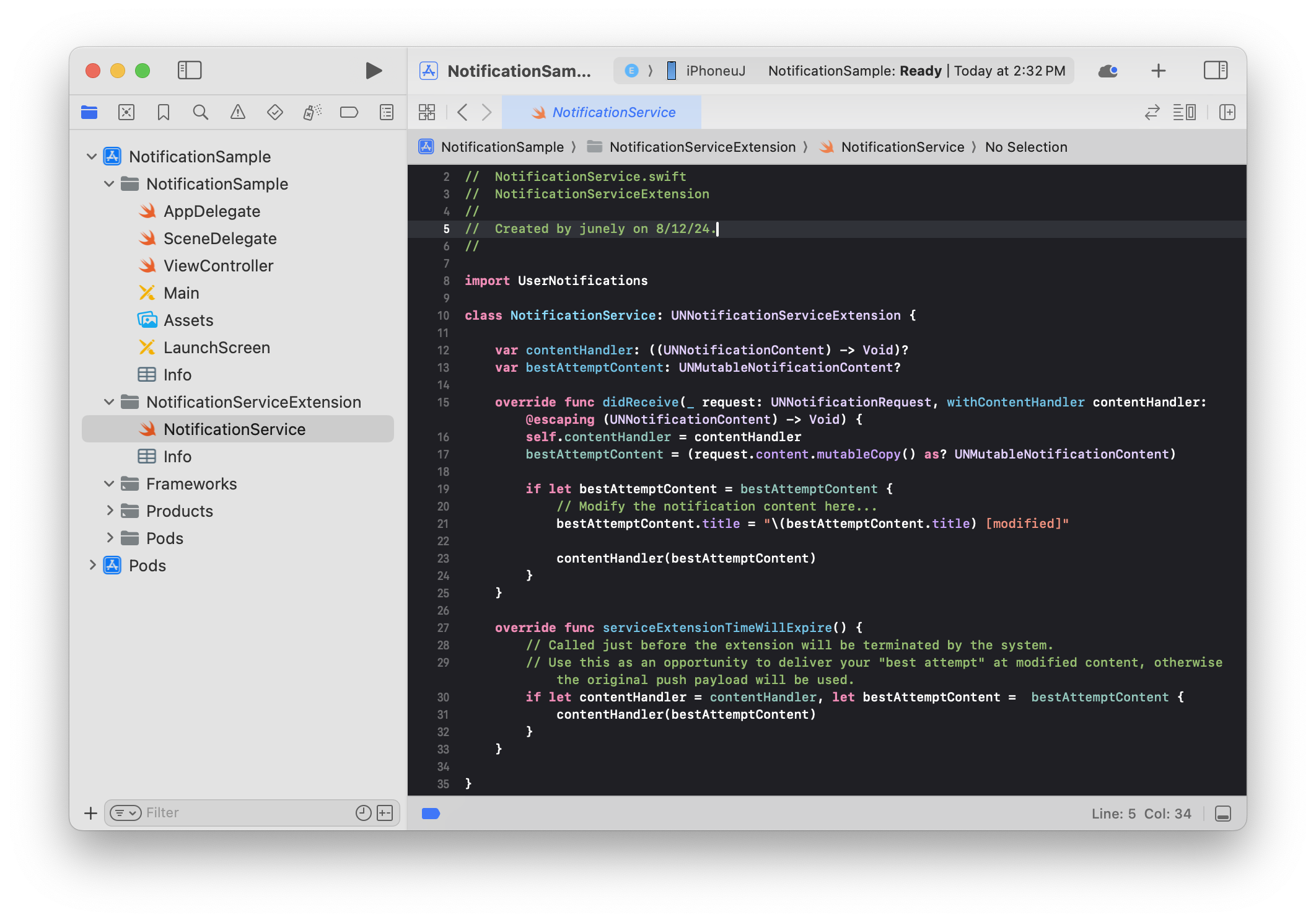 When you open NotificationSample (example project name).xcworkspace, you will see that the Pods project has been added as shown below. You can now import HIVEExtensions in both the NotificationSample and NotificationServiceExtension targets.