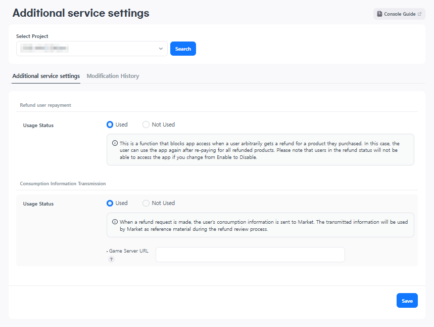 3. Apple Consumption Information Transmission : This is a function that transmits the user's information (refund tendency, app usage time, etc.) to the market when requesting a refund through in-app. Since the market uses this information as reference when reviewing refunds, it can help prevent user fraud and improve usability. The consumption information transmission function currently only supports Apple APP Store. If you make any changes, be sure to click Save.