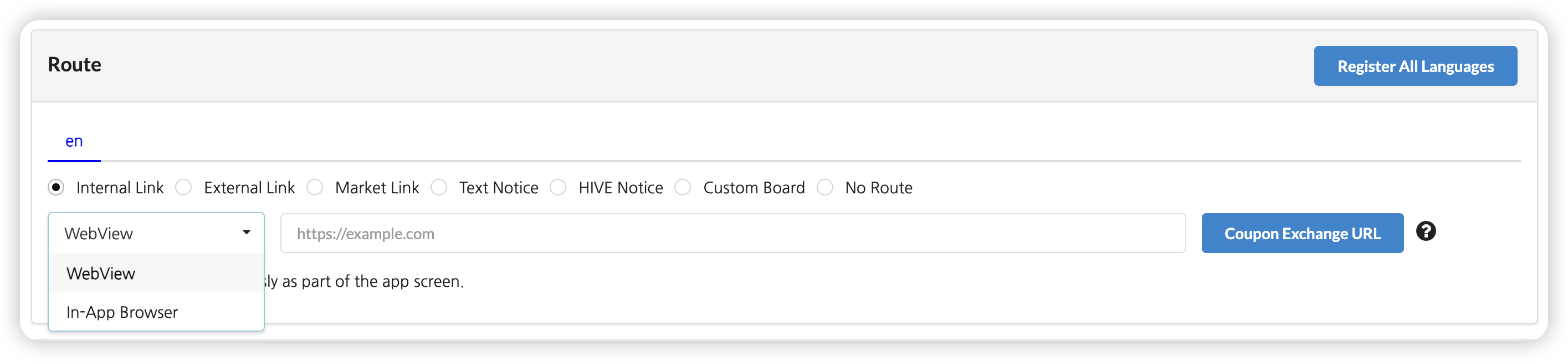 Enter the route to be moved to when you click on the image banner. You can select different types of route per language and you can only set up routes for the language of which the banner is registered. It won’t work even if you enter the route if you use the web banner.