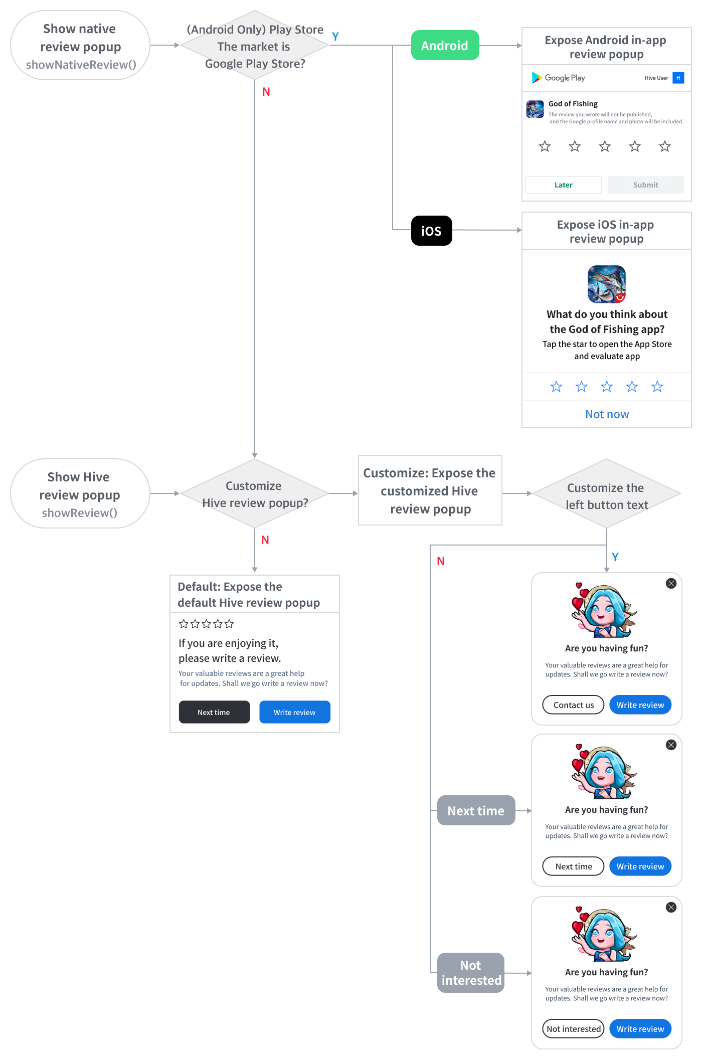 - The conditions for displaying the review popup and the number of displays must be implemented directly in the game according to Hive conditions.