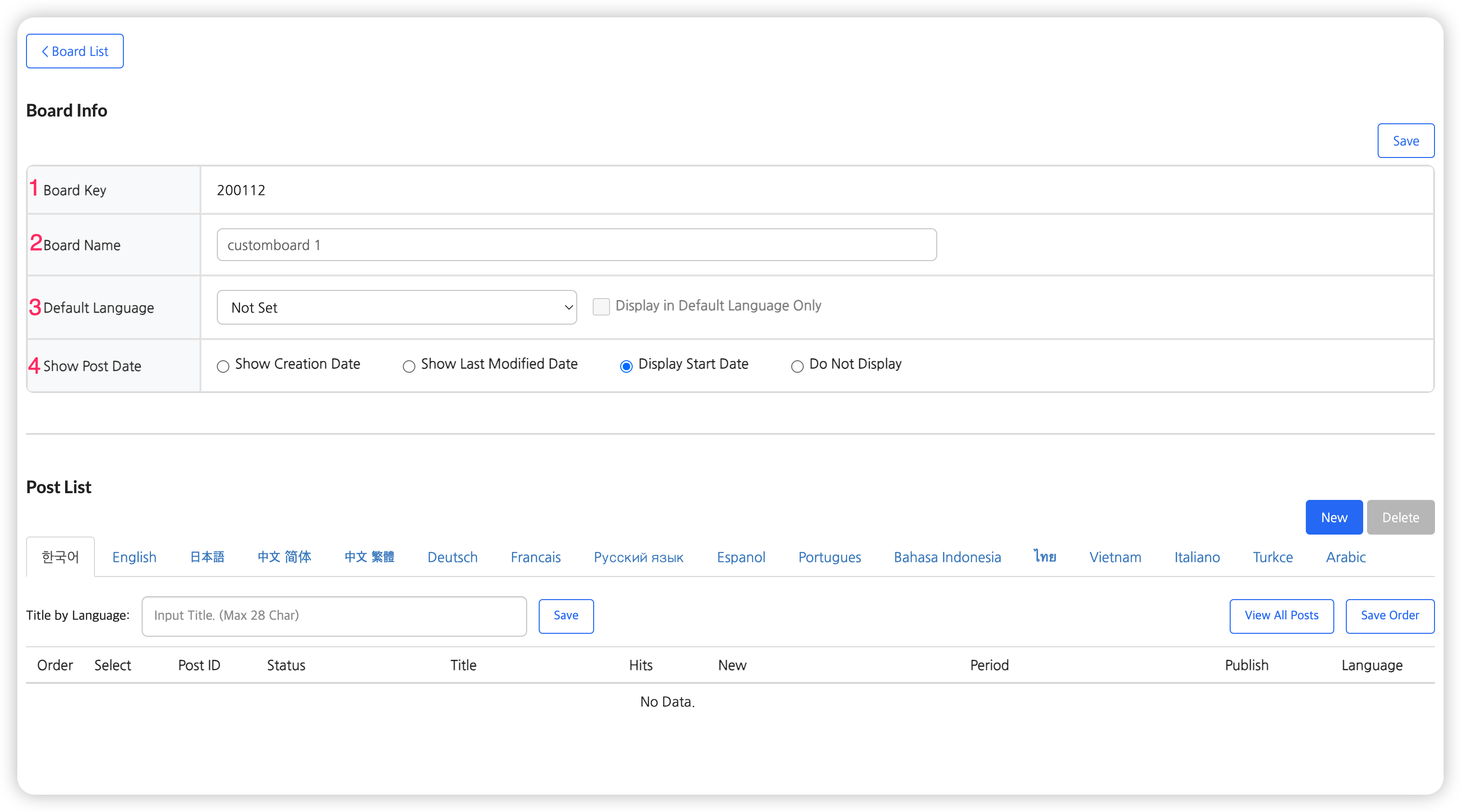 • Select Language: You can register posts in up to 16 languages. Only the selected languages need to be filled in.