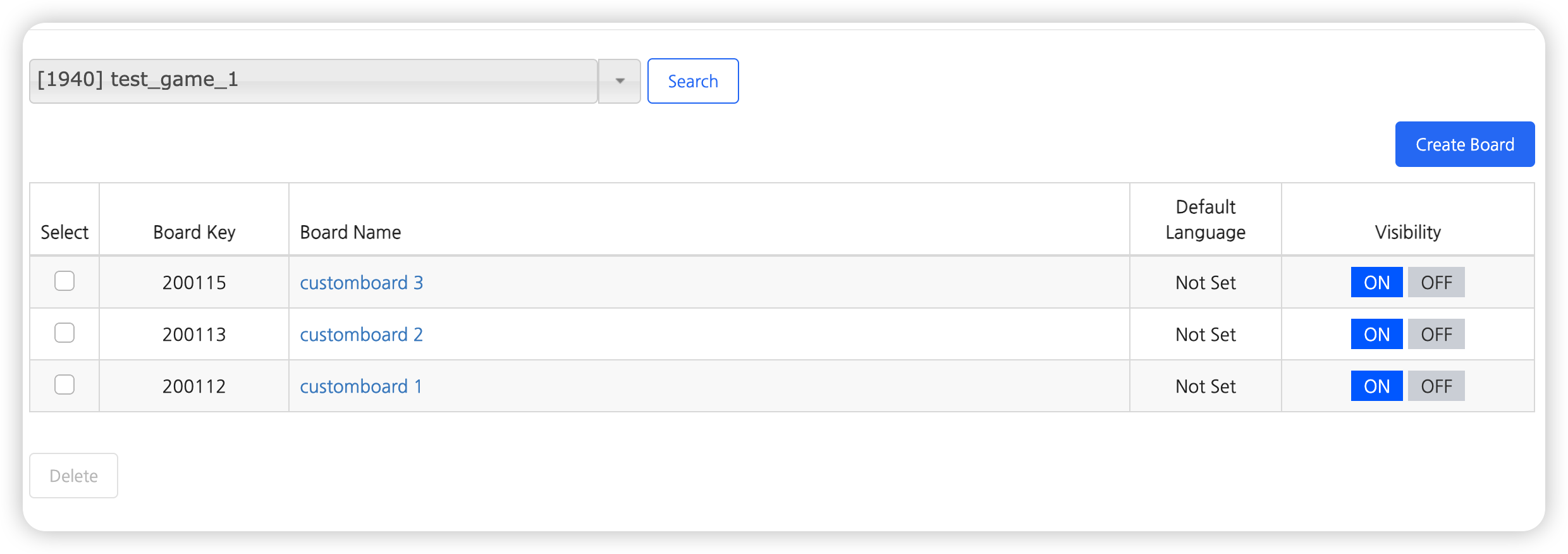 The Board List allows you to view all created boards. You can also create or delete boards from here. board_list_en