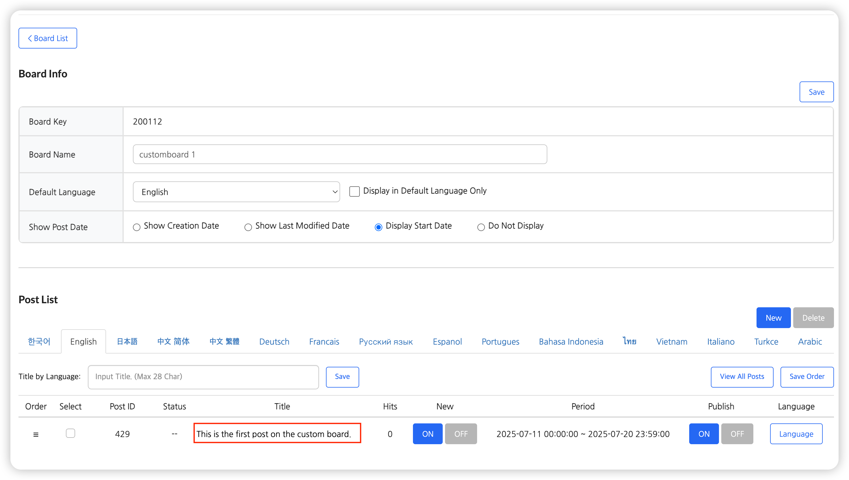 • Custom board posts are shown only in the language in which the content was written. If you want the post to be shown in all languages, use the Default Language settings.