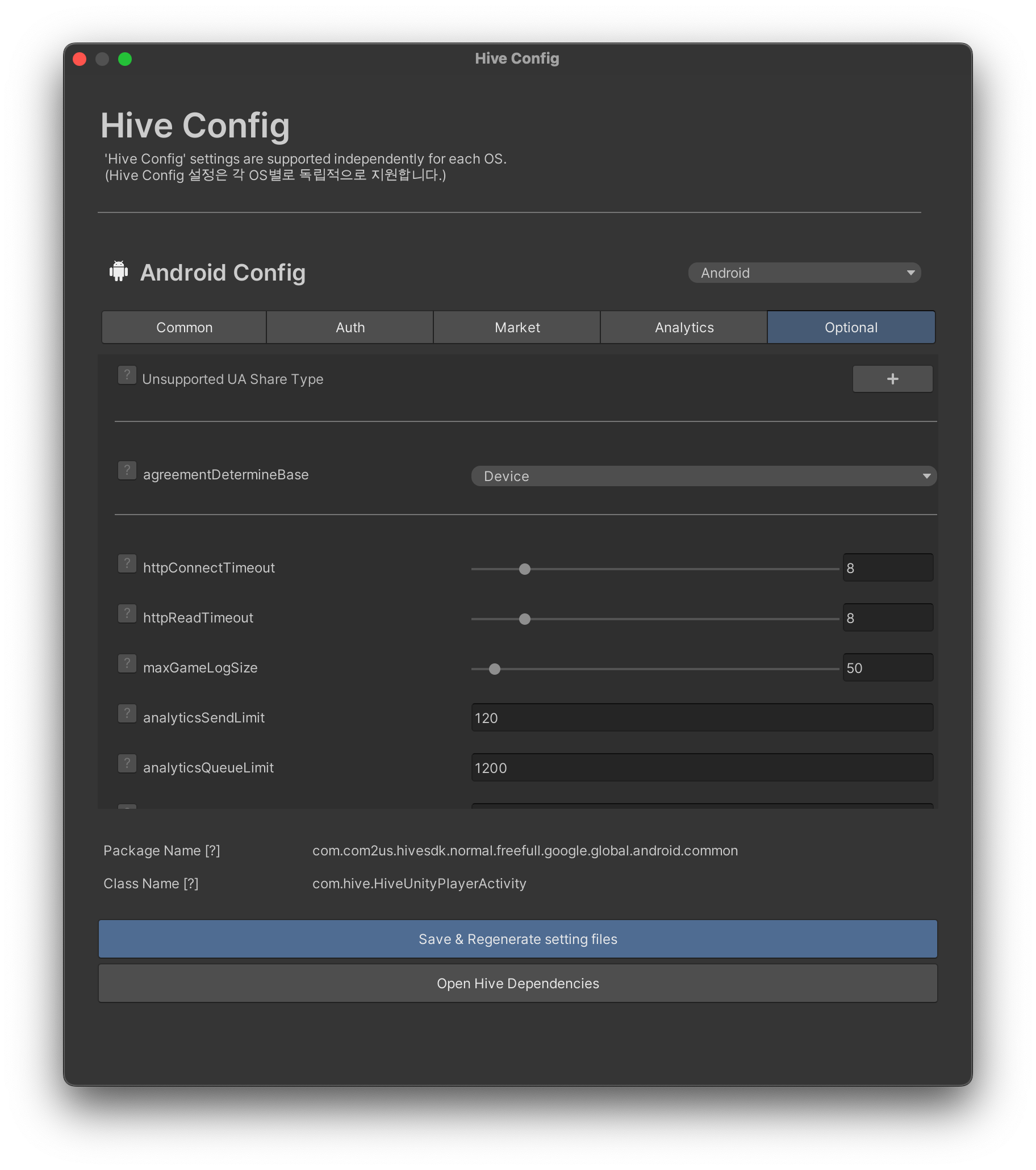 For example, if you want to extend the network timeout when calling an SDK method, increase the values of httpConnectTimeout and httpReadTimeout. As another example, when sending remote logs, you can change the transmission cycle and the size of the transmitted log data, which allows you to modify the Analytics log setting values. It is recommended to use the default values for optional tab items unless absolutely necessary.