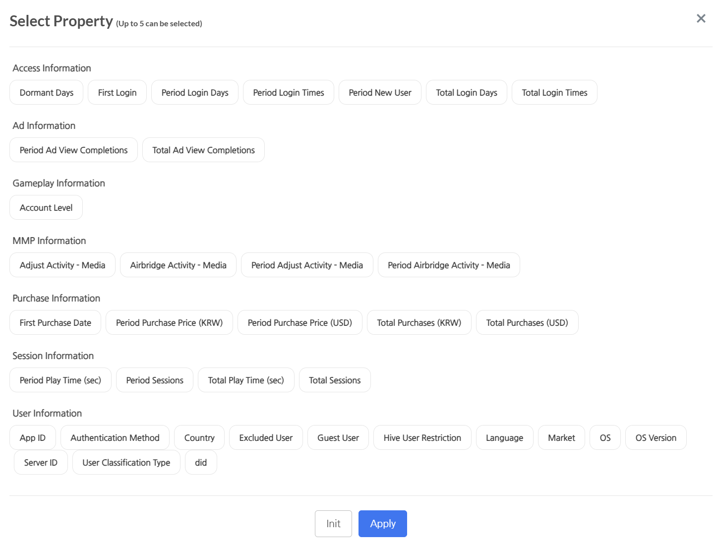 Property Category Property Type Property Name Description Ad Info Numeric Period Ad View Starts The number of times the user has started watching in-game ads during a specific period of time. Numeric Period Ad View Completions The number of times the user has completed watching in-game ads during a specific period of time. Numeric Total Ad View Starts The cumulative number of times the user has started watching in-game ads since their initial access. Numeric Total Ad View Completions The cumulative number of times the user has completed watching in-game ads since their initial access. Purchase Info Numeric Period Purchase Price (KRW) The amount of money that the user has paid during a specific period of time. (KRW) Numeric Period Purchase Price (USD) The amount of money that the user has paid during a specific period of time. (USD) Numeric Period Purchase Count The number of times the user made a payment during a specific period of time. Numeric Total Purchases (KRW) The cumulative amount of payments the user made since their initial access. (KRW) Numeric Total Purchases (USD) The cumulative amount of payments the user made since their initial access. (USD) Numeric Total Purchases Count The cumulative number of payments a user made since their initial access. Date First Purchase Date It refers to the date when a user made their first purchase. User Info String OS User’s operating system (e.g., iOS). String OS Version User’s operating system version (e.g., 13.0.1). String Guest User User’s guest user status. String Country User’s country (e.g., South Korea).