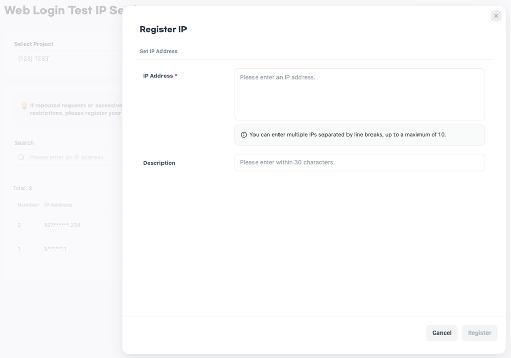 To enhance security, web login access may be restricted if repeated requests or excessive login attempts are detected from the same IP address. IP addresses registered as test IPs are exempt from these restrictions and can access the web login without limitations. The registered IP addresses are managed per project.