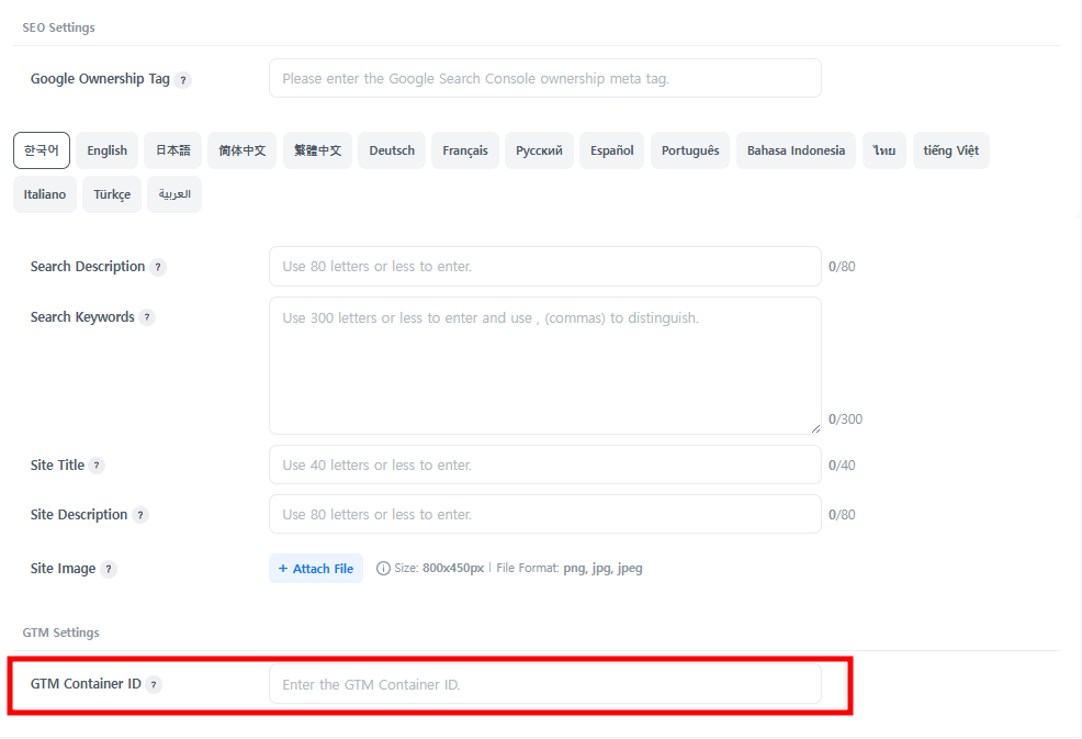 The visitor journey tracking feature for the community is also provided through Google Tag Manager. To apply Google Tag Manager to the community and web shop, enter the GTM Container ID.
