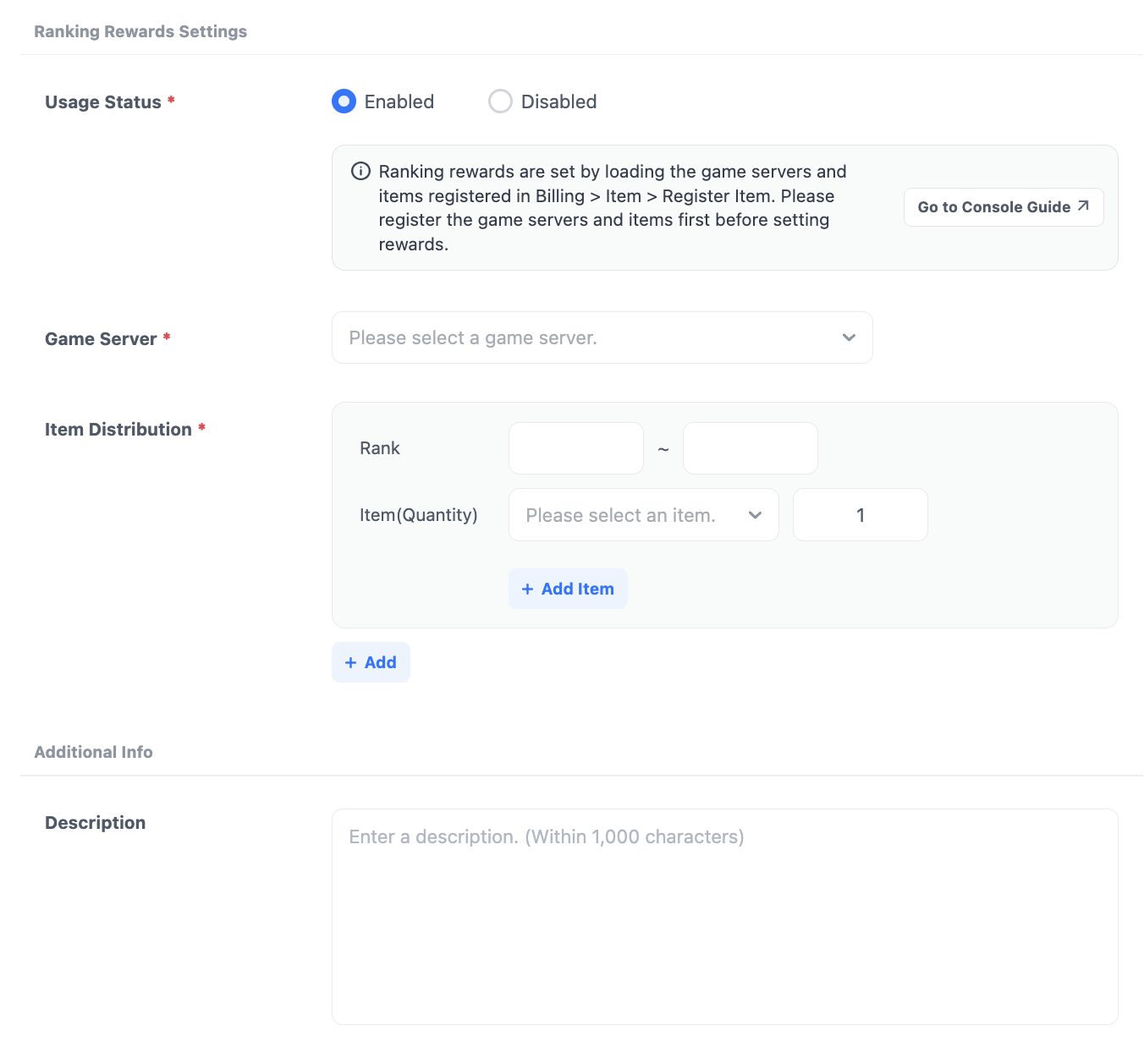 - Rank-based rewards are configured using the game servers and items registered in Billing > Item > Item Registration. Please register the game server and items before setting up rewards.