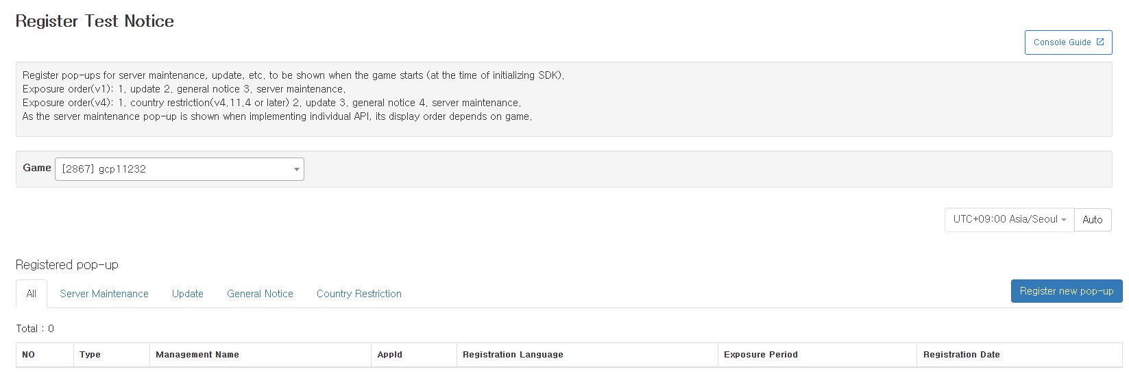 1. Go to Console -> Provisioning -> Pop-up Notice -> Notice. Select the game title you wish to set up pop-ups.