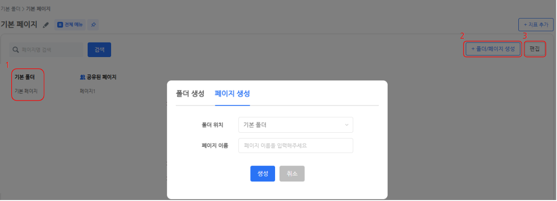 To create a page for placing dashboards, click the 'Create Folder/Page' button, select the folder location in the 'Create Page' tab, enter the page name, and click the 'Create' button.
