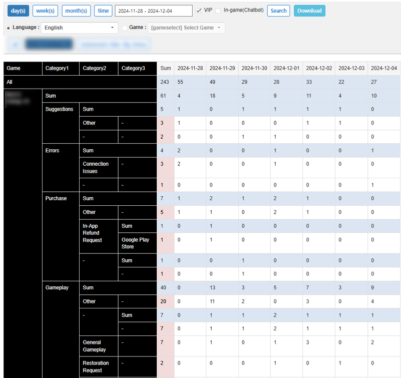 You can check the volume of inquiries received by category based on language and game.