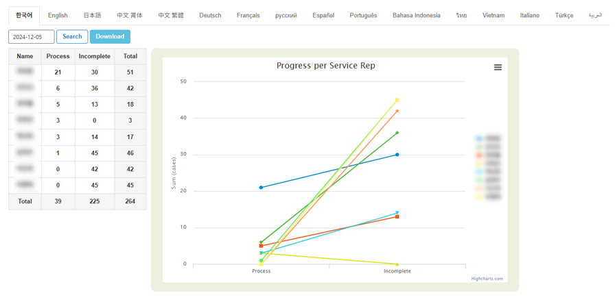 Inquiry handling performance can be reviewed by language and agent for completed cases.