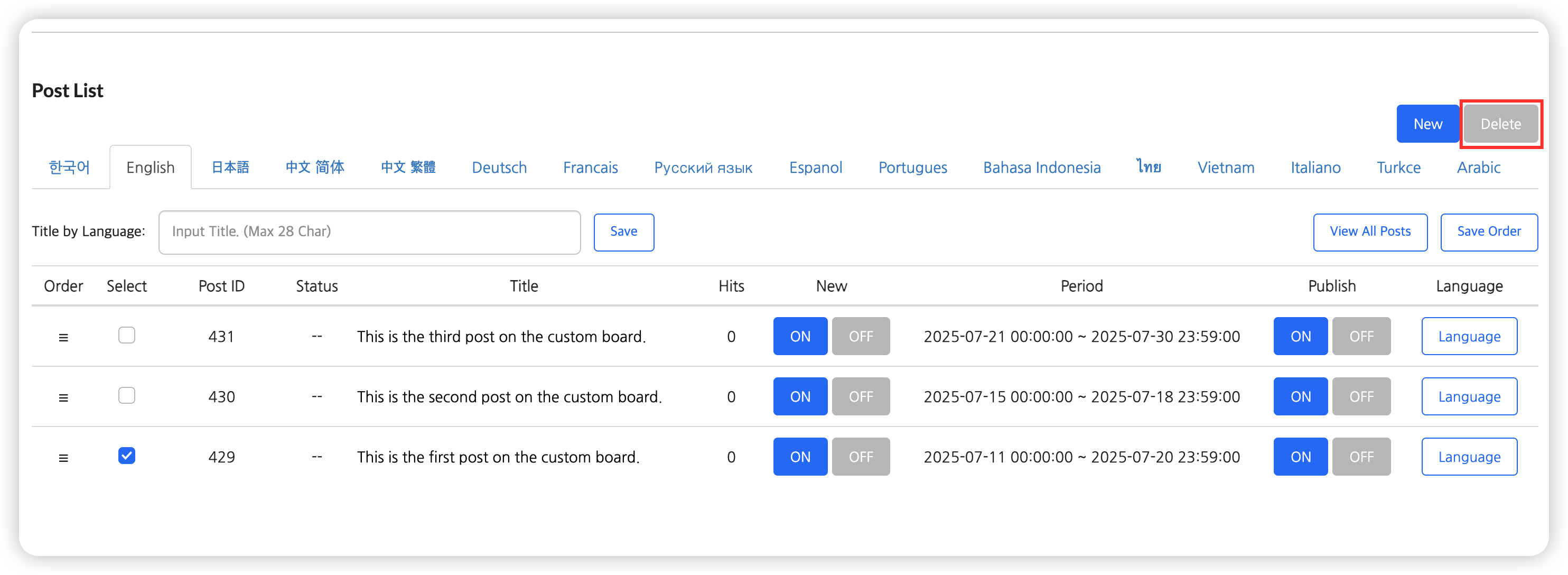 - Example_If you delete post ID 123 from the Korean tab, it will also be deleted from the English tab.
