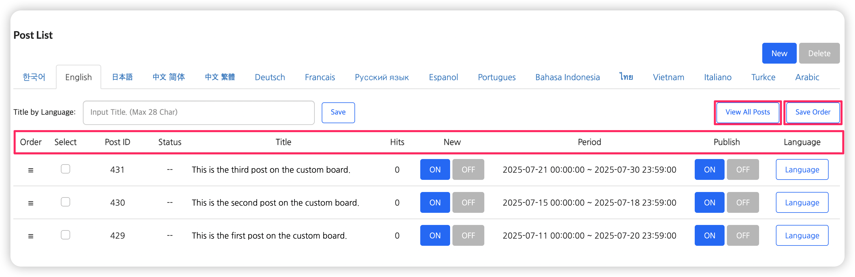 - Status: If the post is within its display period and visibility is ON, it is marked as Ongoing.
