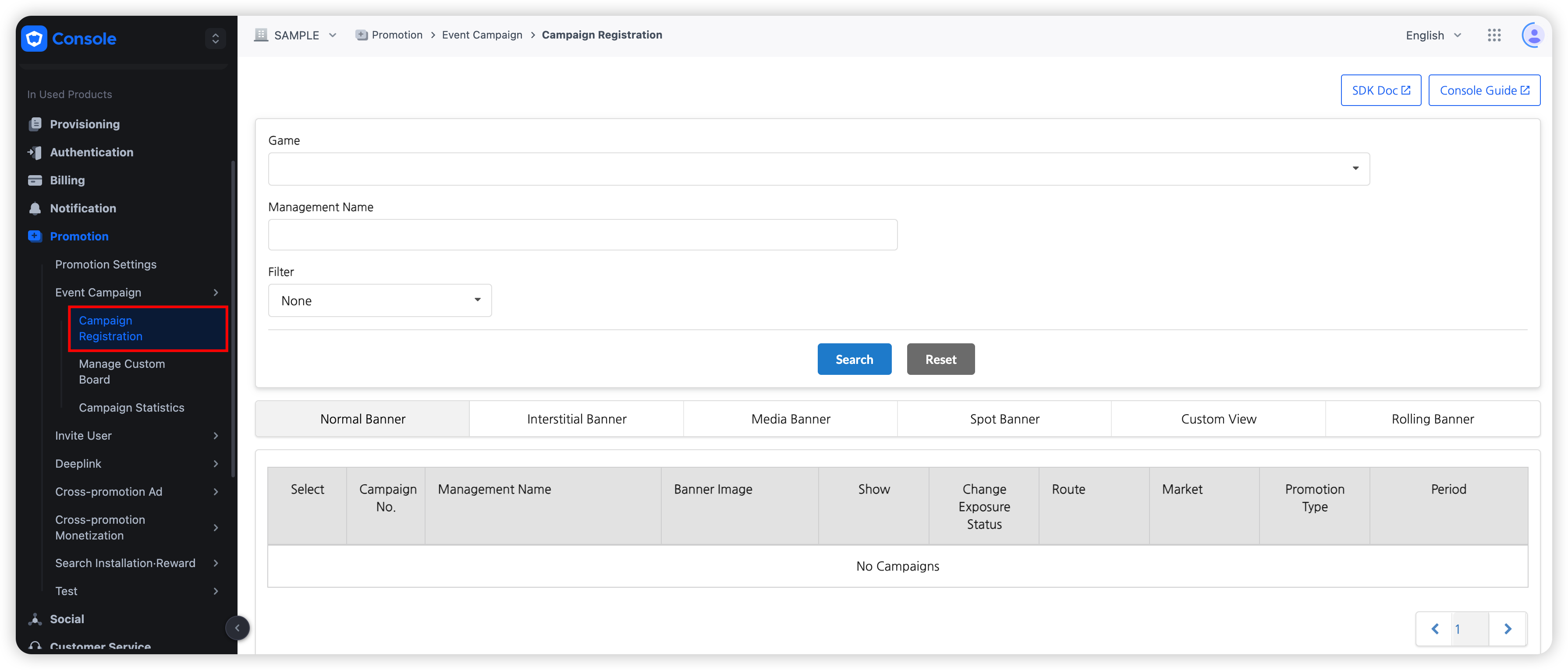- Language: It shows the list of banners registered for selected languages by filtering. For example, if you choose to filter based on Chinese, banners registered for Korean, English, and Japanese won’t be found.