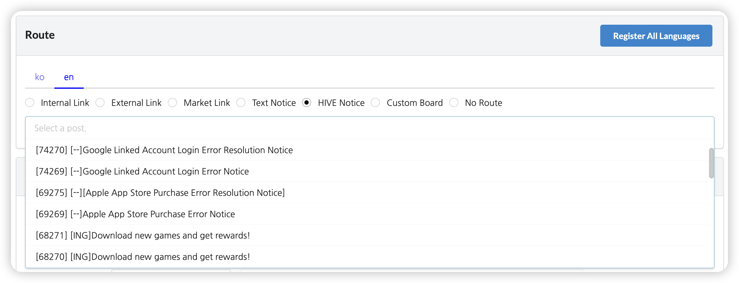 The posts registered to the game's customized board will be displayed as items, and you can select them as paths. Select a board from the first dropdown, then choose a post from the second dropdown. To link to the entire post list instead of a specific post, select Link to Custom Board Post List.