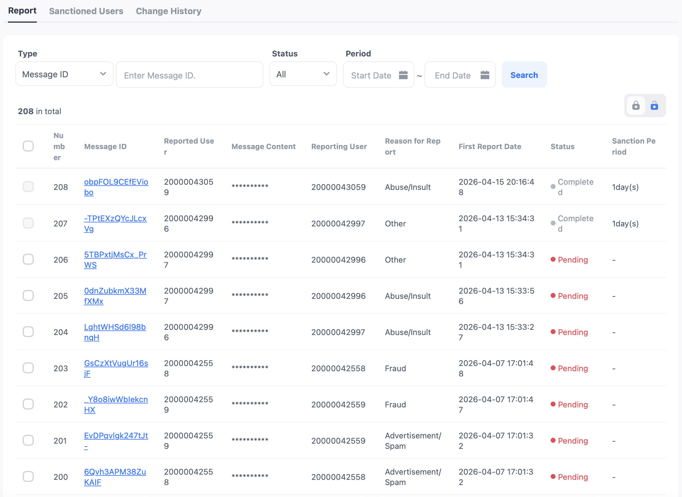 - 最初の通報日 : 1つのメッセージを複数のユーザーが通報できるため、複数の通報の中で最初に受理された通報の日付が表示されます。
