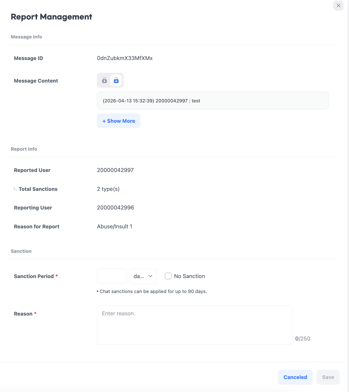 ゲーム内でユーザーが報告したチャットメッセージを確認し、必要に応じてそのユーザーがチャットをできないように制裁することができます。また、すでに制裁されたユーザーの制裁期間を延長したり終了したりするなど、制裁状態を管理することができます。