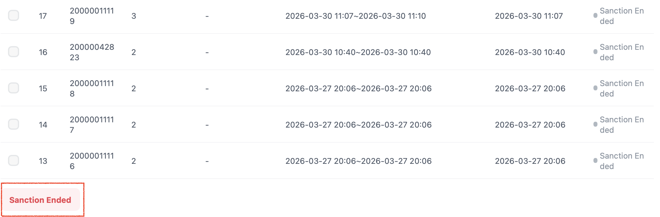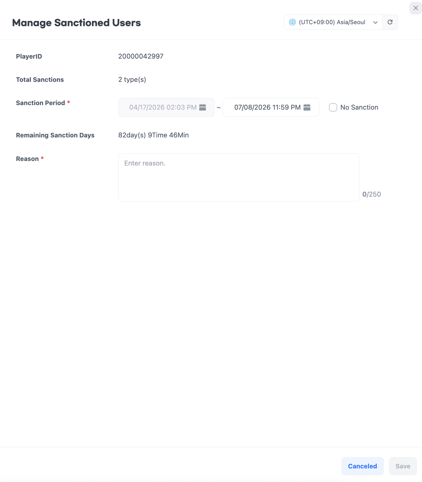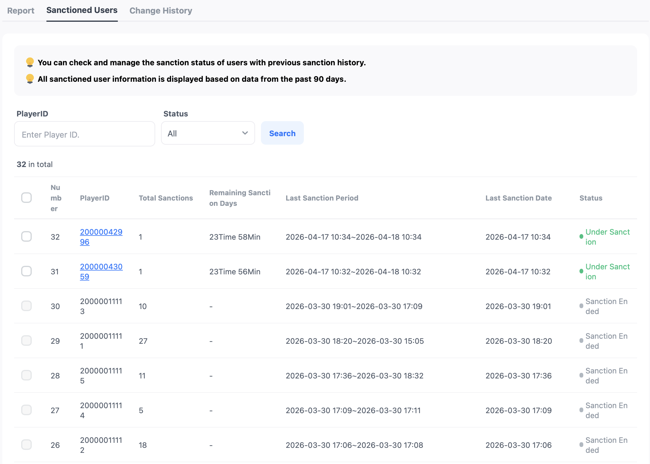 すでに制裁されたユーザーの制裁状況を確認し、期間を調整したり制裁を終了したりすることができます。すべての制裁情報は最近90日以内のデータを基に表示されます。
