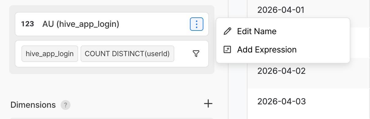 測定値に表示される名前を直接指定できます。元のイベント・属性名の代わりに分かりやすい名前へ変更すると、チャートの凡例とテーブルヘッダーに反映されます。名前を変更すると 変更後の名前(変更前の名前) 形式で表示されます。