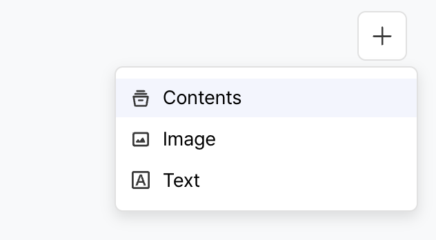 +ボタンをクリックします。 - 追加するパネルタイプ(コンテンツ/テキスト/画像)を選択して、パネルとして追加します。