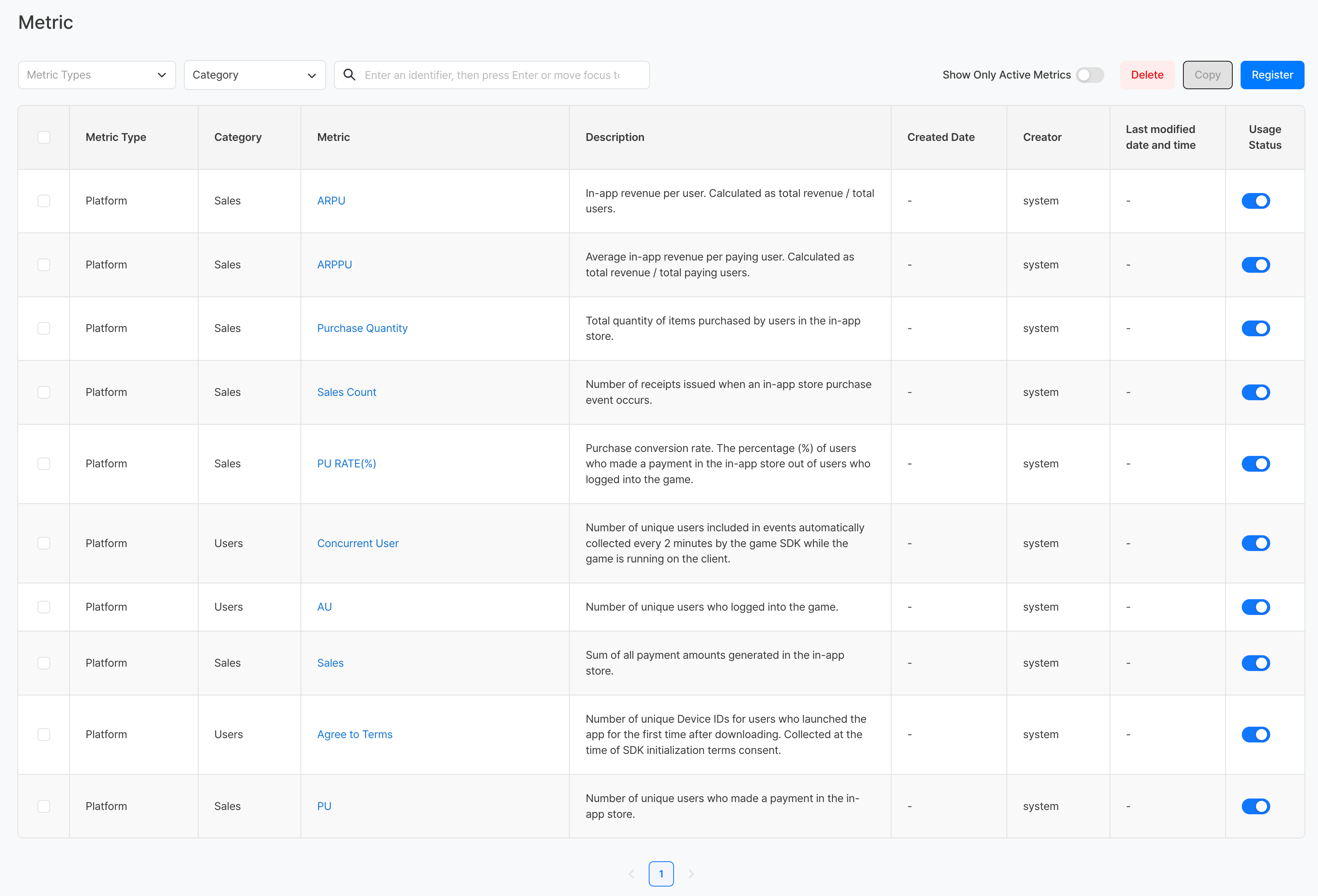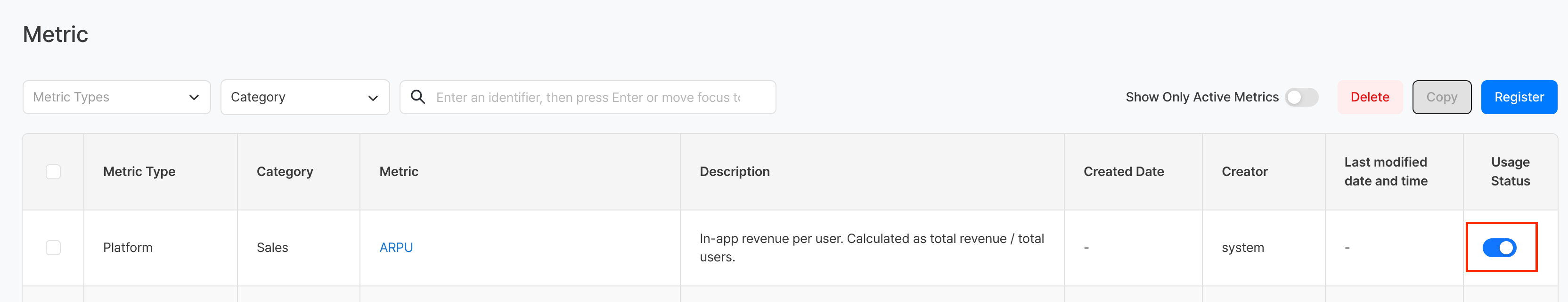 - メトリック種類が「プラットフォーム」以外の場合、一覧の 使用有無 トグルで各メトリックの表示有無を設定できます。