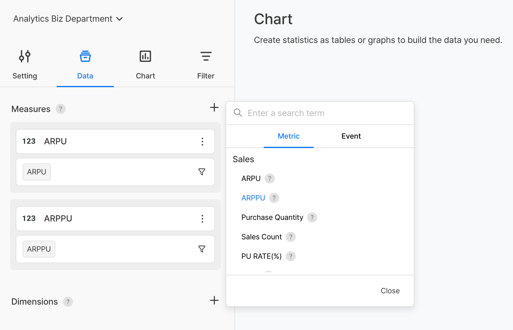 - DAU、MAU、ARPUなどチーム共通KPIをメトリックとして定義すると、全員が同じ基準でデータを共有できます。