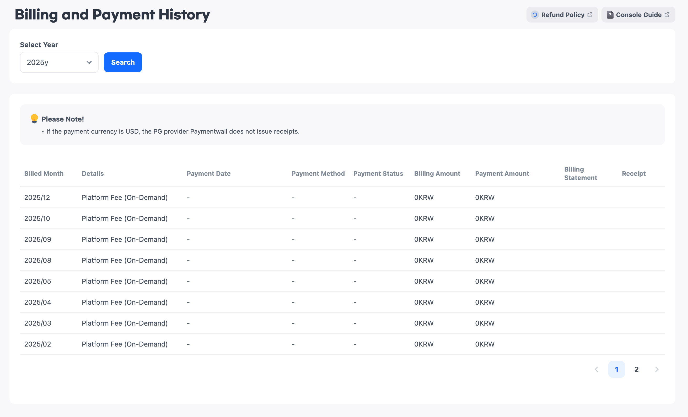 - 領収書: 決済通貨が韓国ウォン(KRW)の場合にのみ、PG社が提供する領収書を確認できます。決済通貨が米ドル(USD)の場合、領収書リンクは提供されません。