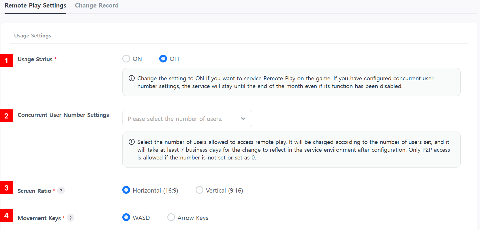 • サービス終了基準:リモートプレイを「無効」、プロジェクトステータスを「終了」、同時ユーザー制限を「0」に設定。( 注: リモートプレイが有効で、同時ユーザー数制限のみが 0 に設定されている場合、Web サイトはアクティブなままです。 )