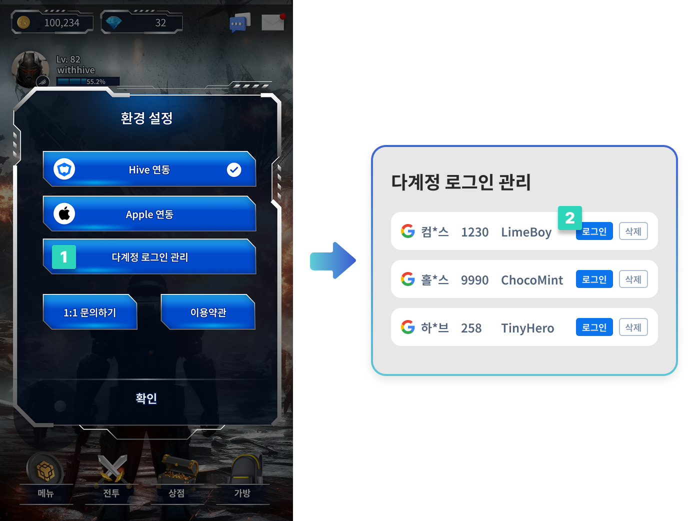 - ユーザーがログアウトし、再度ログインしようとすると、ログイン画面で**マルチアカウントログイン管理**をクリック → 保存されたアカウント情報(PlayerIDリスト)を取得するためにAPIを呼び出します