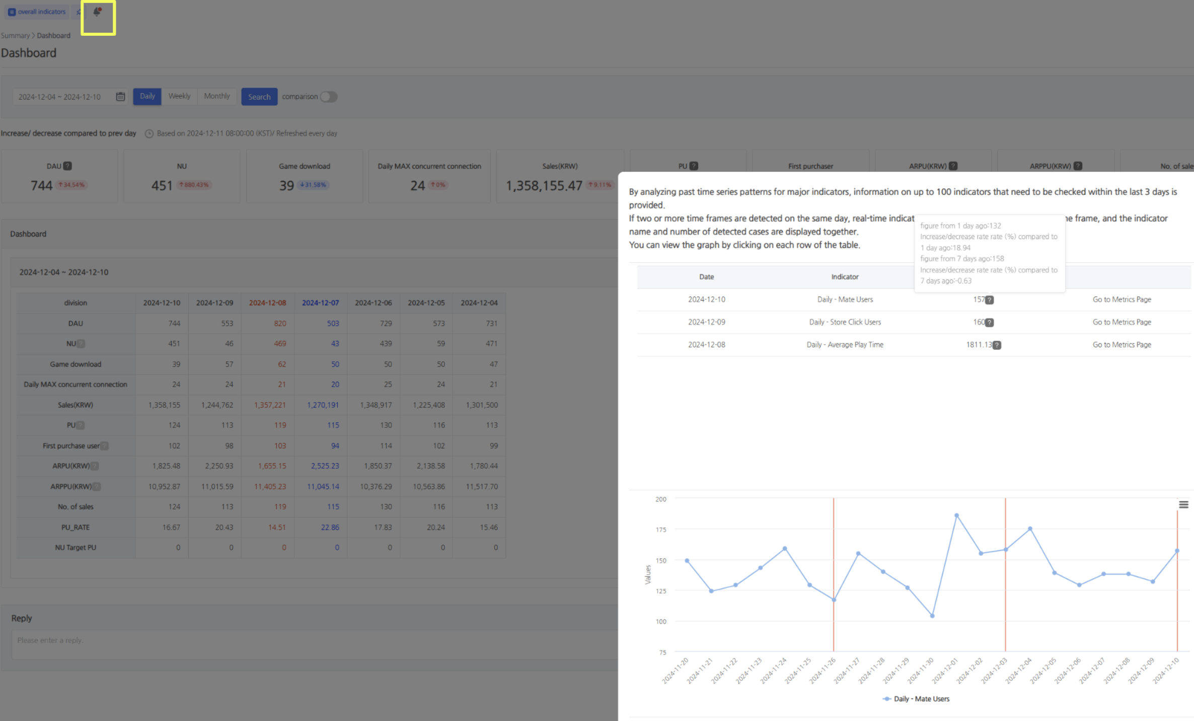 • 日次/週次/月次の売上、PU、初回購入者、販売数量、ARPU、ARPPU、およびPU RATEの国/市場固有の指標を提供します。