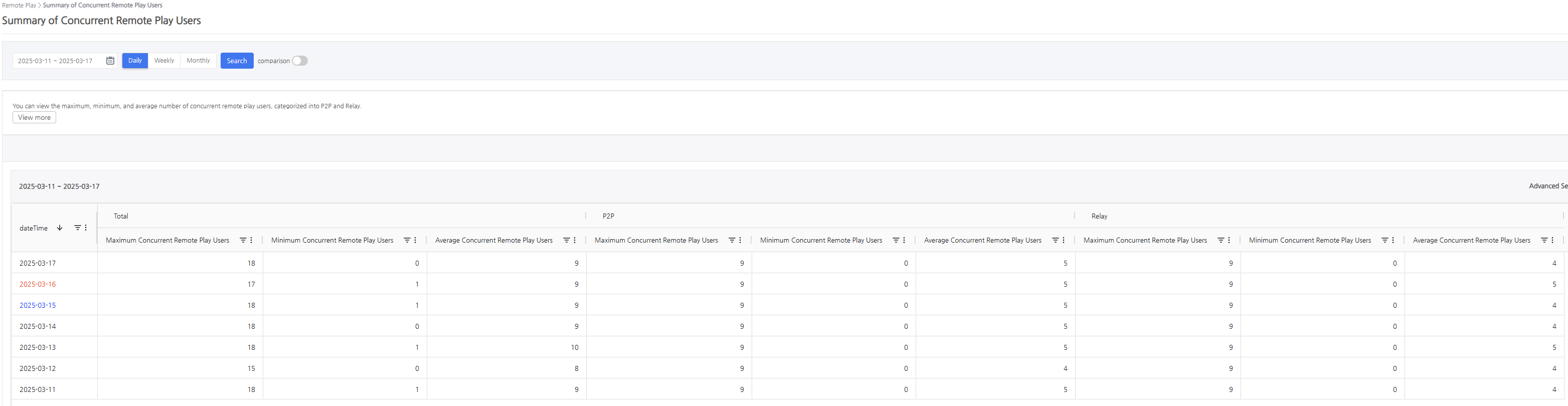 • P2P、Relayに区分されたリモートプレイの同時接続者数の最大、最小、平均の数値を日別/週間/月間で提供します。