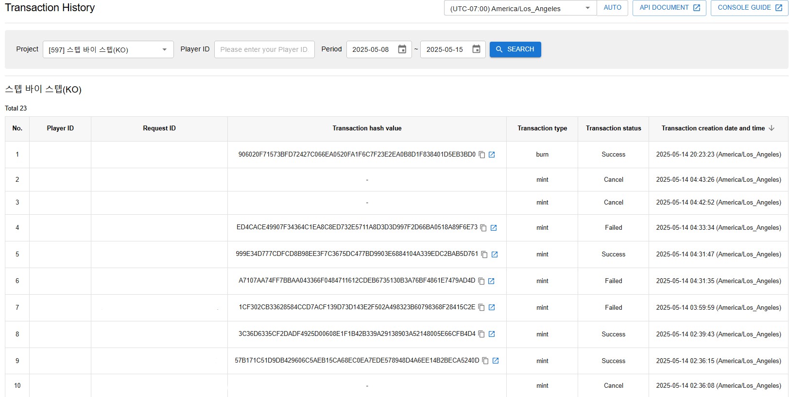 ゲームとプレイヤーIDによってXPLAメインネットに送信された取引情報を表示できます。