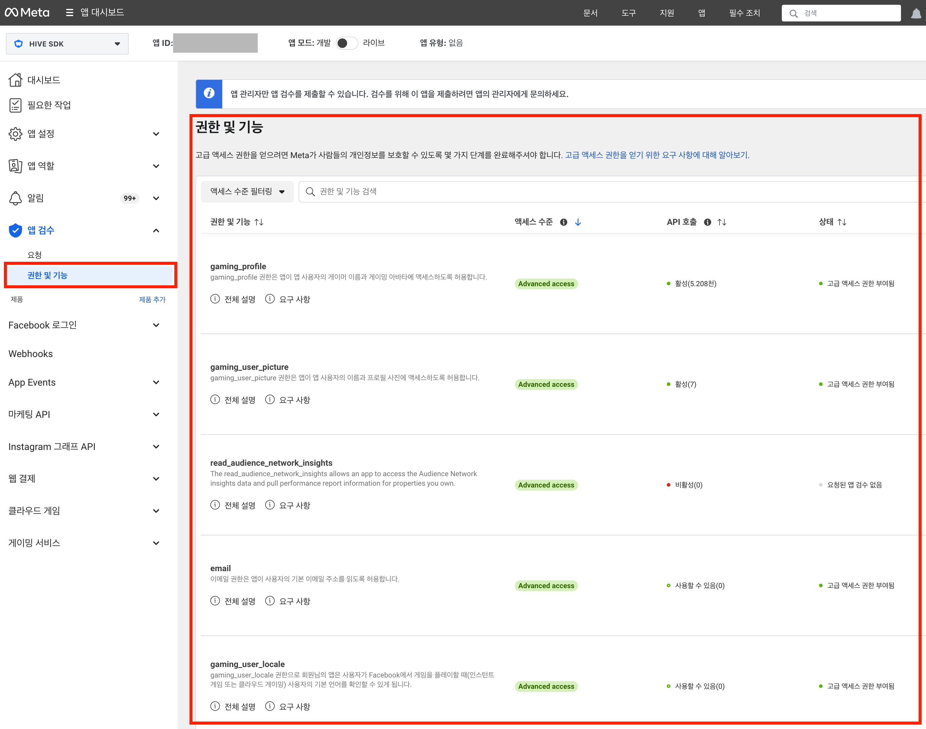 Facebook SDKを使用する際、Hive によって設定されたデフォルトのメール権限(Facebookアカウントのメールアドレスへのアクセス)およびpublic_profile(Facebookの公開プロフィールへのアクセス)を超える追加の権限が必要な場合は、Facebookコンソールで必要な権限をリクエストできます そして、権限フィールドに権限を設定します。Hive でFacebookでログインする際、ログインリクエストには権限フィールドに設定された権限が含まれます。