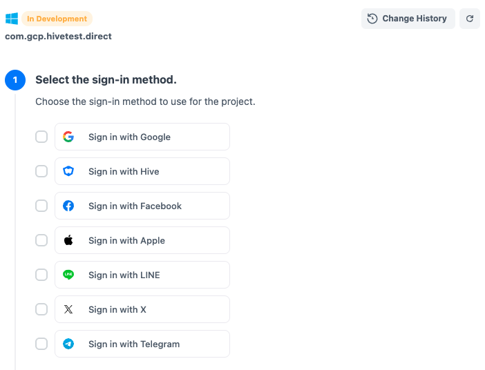 - 各ストアから提供される認証キーをコピーし、サインイン設定ページに貼り付けます。すべてのサインイン方法がサインイン設定メニューに認証キーを登録する必要があるわけではなく、一部はHive SDKに直接登録する必要があることに注意してください。各ストアの認証キーを登録するための詳細な手順は以下に示されています。