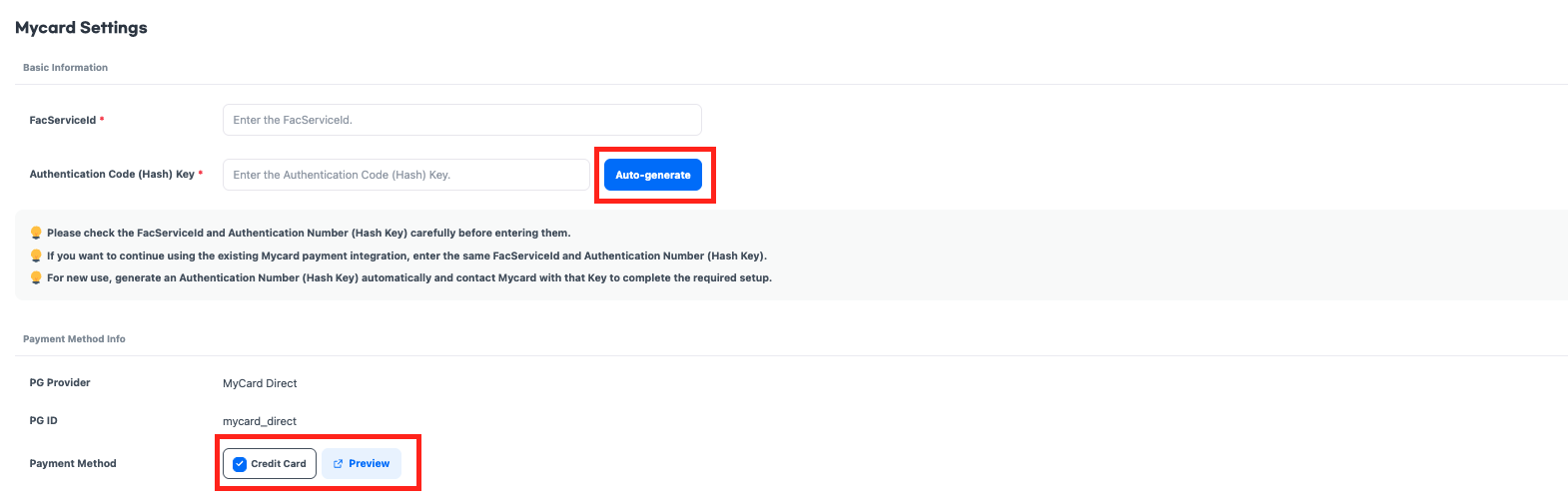 - MyCardから提供されたFacServiceIDを入力してください。