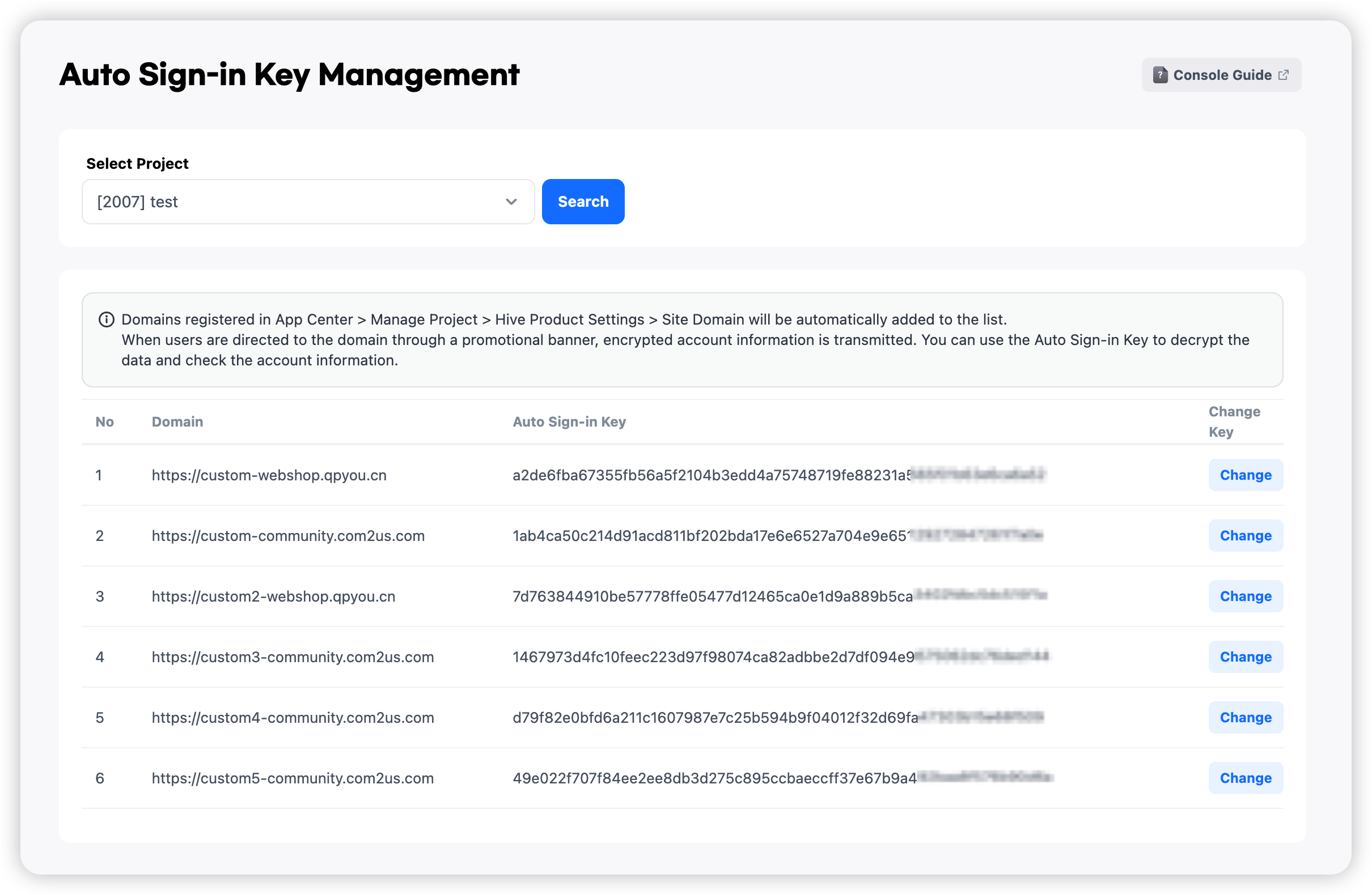 1. 'Console > App Center > Manage Project > Hive Product Settings > Site Domain' で自動サインインをサポートするウェブサイトのドメインを登録します。