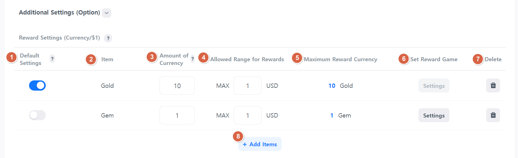 - 報酬として与えられるアイテムに基づいて、1 USDに相当する通貨の額を入力します。